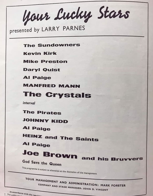 Turning professional meant a new life for the boys. During the next year they performed in the best venues touring the UK with stars; Joe Brown, Dee Dee Sharp, Johnny Kidd & The Pirates, Heinz, Manfred Mann, Gerry & The Pacemakers, The Crystals, Dusty Springfield, The Tornados and others. Their transport was an old converted ambulance purchased for £90, they travelled over 40,000 miles and slept in bunks. Martin being the smallest got the crib at the front of the van where his nose would touch the roof if not careful. The roadmanager, Dennis Pimlott slept in the cab.
