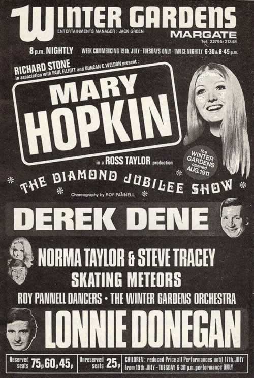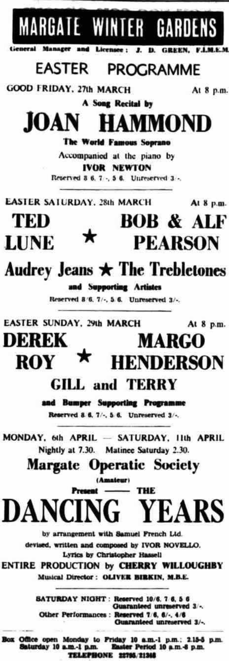 - Advertised as Winter Gardens - Margate General Manager and Licensee : J. D. Green Sunday, 25th June At 8 p.m. Petula Clark And Bumper Variety Bill Reserved 7/6, 6/-, 4/6 ; unreserved 3/-.