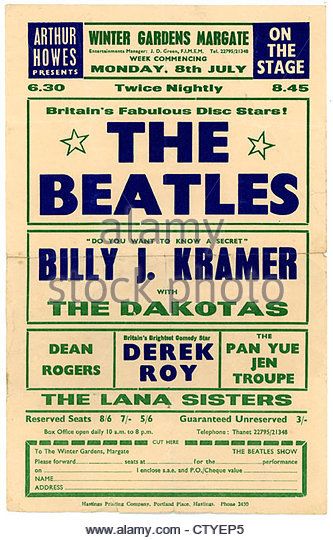 - Monday, July 8, 1963: The Beatles, The Lana Sisters, Billy J. Kramer and the Dakotas, The Dakotas, Dean Rogers, Don Crockett, Pan Yue Jen Troupe. Advertised as Monday, 6th July and Week 6.30 Twice Nightly 8.45 * The Beatles * Billy J. Kramer and the Dakotas And Bumper Supporting Programme Reserved Seats 8/6, 7/-, 5/6 Unreserved 3/-..