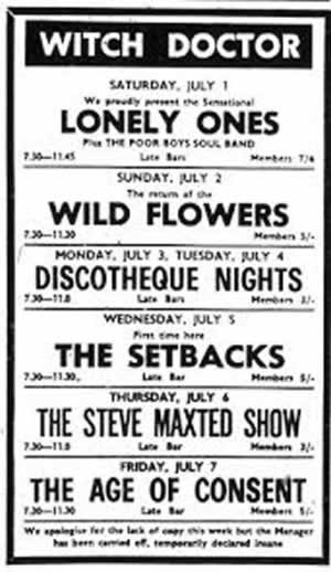 The last gig at The Witch Doctor was on Saturday, October 7, 1967 with Si's Reaction and the Coconut Mushroom and then it closed.