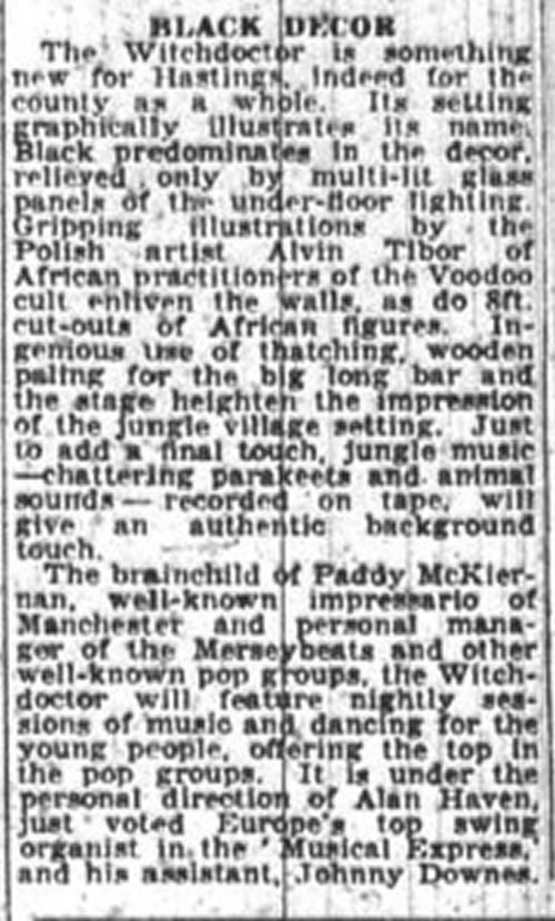 It was advertised as Crazy ! Crazy ! Crazy ! McKiernan Entertainments (London) LTD proudly announces the South Coast's New 7 nights a Week Monster The Witch Doctor The Dolphin, Marine Court, St. Leonards Telephone: Hastings 1443 Opening next Friday, July 17th, 7.30 to 11.30 with Direct from their Sensational Nation-wide to with the '' Chuck Berry Show '' The Nashville Teens '' Tobacco Road '' Plus Buddy Brittan and the Regents Advance Tickets 4/- (5/- at the door) Tickets available at-The Disc Jocky, Queens Road, Hastings and The Witch Doctor, St. Leonards Featuring The Top in Rock ' Twist ' Shake ' R & B Each and Every Night. Destined to became the South's most exciting meeting place. Must be seen to be believed Fully Licensed Voodoo Bar. Join The Witch Doctor R & B Sunday Club. Membership only 1/- a year. You may join on the night.